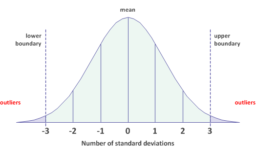 The distribution of values in the data sets that you analyze in Analytics may often be skewed rather than normally distributed. For example, a transaction file may have thousands of relatively small transactions, and a few large transactions. However, we can use a normal distribution for a simple illustration of how outlier boundaries work in Analytics.