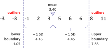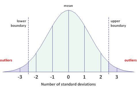 To position the boundaries, you specify any positive multiple of the standard deviation of the outlier field: 0.5, 1, 1.5, and so on. For example, if you specify a multiple of 1.5, the outlier boundaries are 1.5 standard deviations above and below the mean or median of the values in the outlier field.